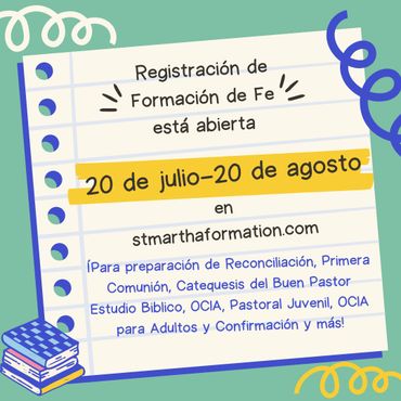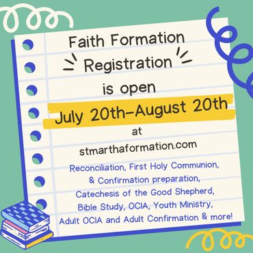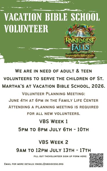 Please consider serving the parish as a catechist, youth minister, or parent volunteer so that we can continue to offer the St. Martha community all of these wonderful programs and events! If interested, contact the Religious Education Office below or by phone 951-698-8180 ext. 242.